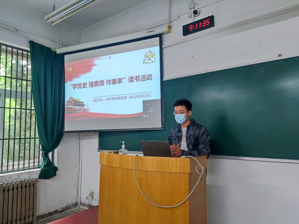 春暖人间四月天,正是读书好时节。2022年4月23日是第27个“世界读书日”,为了充分激发同学们的读书热情,营造崇尚知识,热爱阅读的浓厚氛围,进一步推进党史学习教育深入人心,迎接党的二十大召开。值世界读书日,硕2006、2007联合党支部以线上线下结合的形式,在B140室开展了“学党史 强素质 作表率”世界读书日活动,在阅读中激发智慧,在交流中增长知识。
