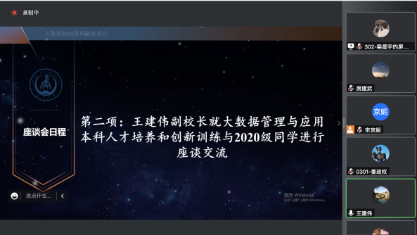 为进一步提高本科人才培养质量,积极引导学生开展创新创业训练,问需于生,全面了解学生在学习、生活中遇到的困惑与难题。2022年9月20日晚20:00,副校长王建伟教授与学校首届(2020级)大数据管理与应用专业70名学生进行了真诚而深入的交流。大数据管理与应用系主任房建武副教授、2020级学生班主任董是老师和宋京妮老师参加座谈。