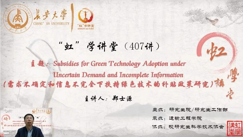 11月28日下午,由研究生院/研究生工作部主办、后宫电影院 承办、院研究生科学技术协会协办的“虹”学讲堂第407讲(线上)讲座顺利举办。此次“虹”学讲堂,邀请了上海海事大学交通运输学院郑士源教授作题为“Subsidies for Green Technology Adoption underUncertain Demand and Incomplete Information(需求不确定和信息不完全下扶持绿色技术的补贴政策研究)”的学术报告。我校相关学院共计300余名师生参加了此次讲座。