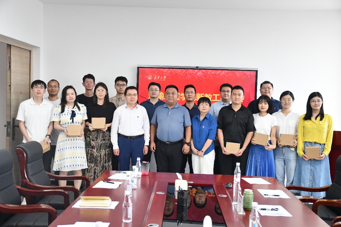 院领导为14位新教工赠送纪念品,并合影留念。