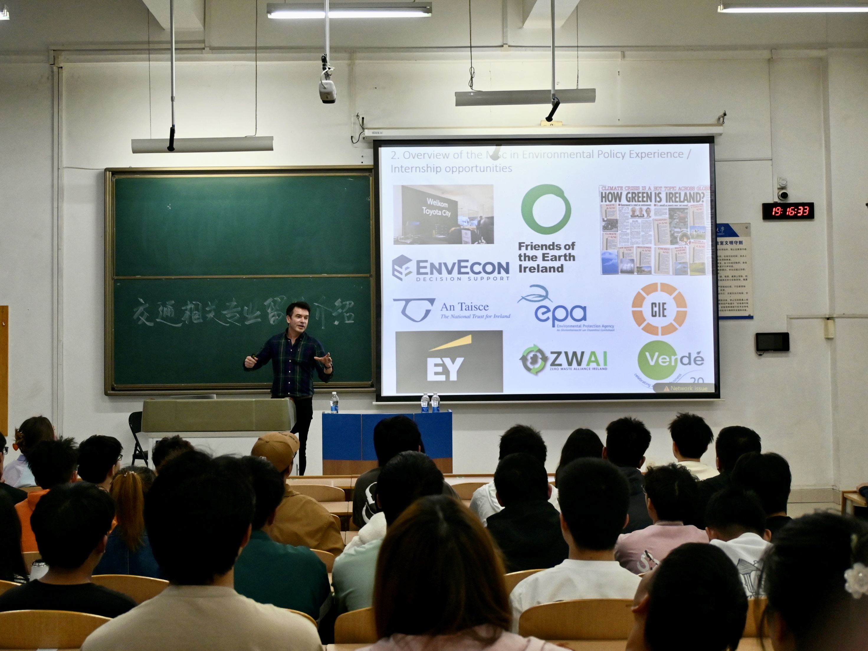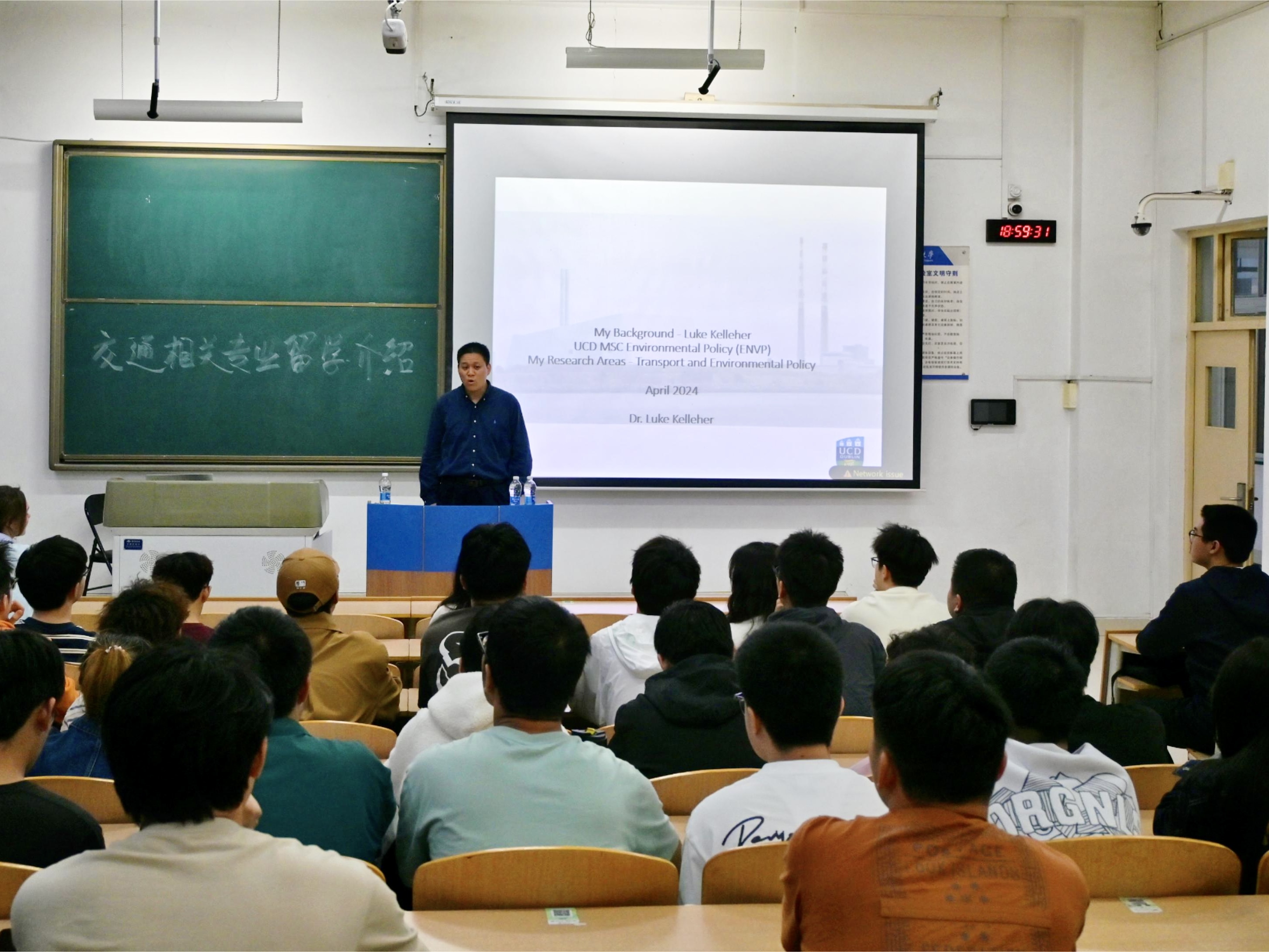 讲座伊始,Dr. Kelleher首先介绍了自己的学术背景,以及他在UCD的教学和研究工作。他强调了环境政策在当前全球背景下的重要性,同时讲解了交通、城市规划与环境政策项目的课程结构、所需学分以及如何通过该项目培养学生在交通规划和环境政策领域的专业技能。他的分享让在场学生对交通领域专业留学深造有了更为深入的了解。