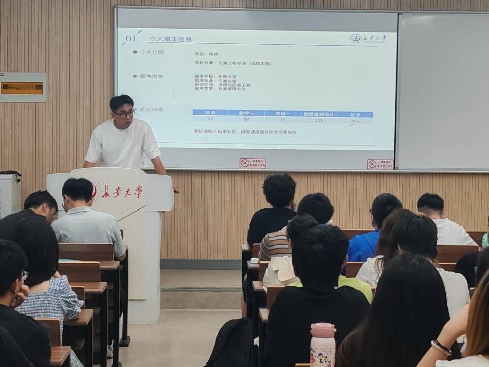 分享会邀请成功上岸后宫电影院 、中南大学、北京交通大学、西南交通大学、大连海事大学和东南大学的优秀同学分享自己的考研经验和心得。分享内容围绕考研科目的学习策略以及心态调整等方面,为现场学生推荐复习资料以及学习软件。分享会最后,在场学生踊跃发言提问,分享者一一耐心解答问题。