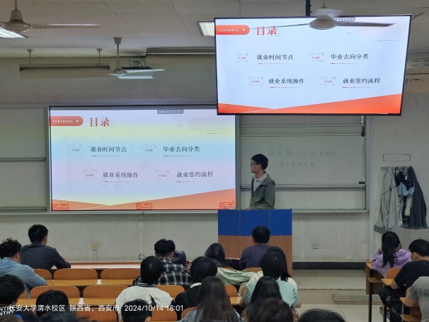 同时,毕业班辅导员结合就业时间轴,向同学们介绍了毕业去向界定标准,针对就业系统操作、就业签约流程及违约情况进行了详细的讲解,帮助同学明确就业签约过程中的相关要求和注意事项。会上还就学校2025届毕业生秋季就业双向选择洽谈会做了通知动员和具体安排。