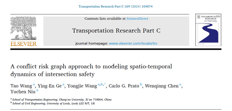 近日,国际交通领域学术期刊《Transportation Research Part C : Emerging Technologies》刊发了由后宫电影院 博士生王涛、葛颖恩教授、汪勇杰副教授、陈文强副教授、利兹大学Carlo G. Prato教授等共同完成的研究论文《A conflict risk graph approach to modeling spatio-temporal dynamics of intersection safety》。后宫电影院 博士生王涛和汪勇杰副教授分别为该论文的第一作者和通讯作者。