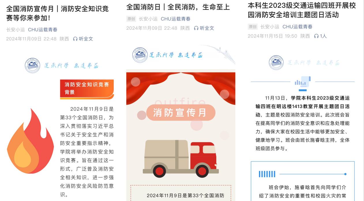隐患排查,加强安全宣传教育。在消防安全月活动期间,学院辅导员深入学生宿舍开展消防安全隐患排查工作。通过深入细致的排查,及时发现并整改了一批潜在的消防安全隐患,进一步夯实了校园消防安全基础。同时,学院还通过微信公众号平台等线上渠道,广泛宣传消防安全知识和法律法规,营造了浓厚的消防安全氛围。