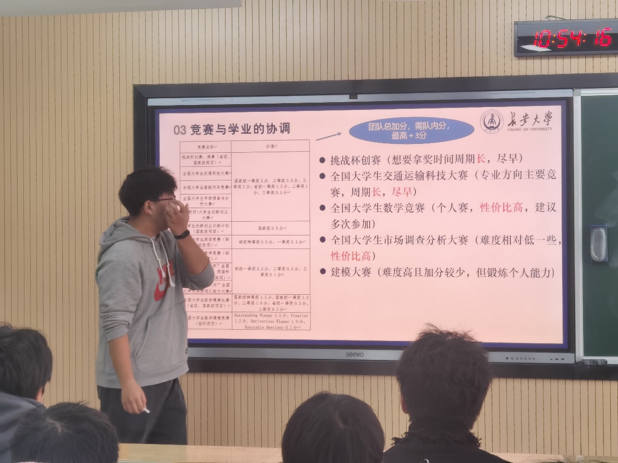 马壮林以“明确当前竞争态势,合理规划时间安排”为题,从竞争压力的分析维度、时间管理核心原则等方面,详细讲解了如何结合自身实际制定目标和时间规划。他强调了提前明确未来方向的重要性,并分享了个性化规划策略,同时提醒同学们在执行过程中注重计划的灵活性与可操作性,以确保目标实现的科学性与可行性。他希望各位同学要珍惜大学时光,科学规划时间,以严谨的态度专注学业,坚定目标、不懈努力,争做优秀的新时代大学生。