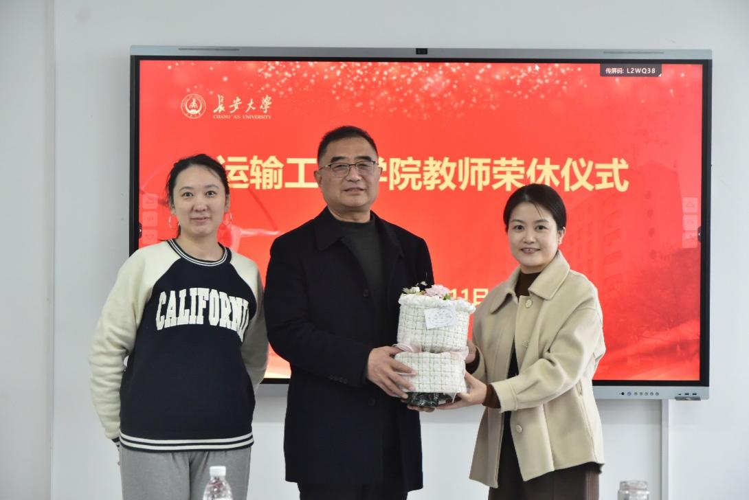 在温馨感人的氛围中,院工会主席徐婷,教师代表、交通工程系党支部书记张敏为田新民赠送鲜花和纪念品。