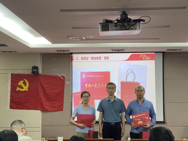 接着,为强化党员的身份意识和责任意识,增强组织归属感,支部为政治生日在第一季度的两名党员庆祝“政治生日”。王建军代表学院党委赠送“生日”贺卡和礼物,既传递了组织的殷切祝福,又给予了党员一份沉甸甸的政治责任。两名过“政治生日”的党员分别发表感言,重温了入党历程,结合自身成长经历和当前工作实际,表达了对党组织的感激之情,进一步坚定了听党话、跟党走、为党奋斗终身的决心。支部全体党员面向鲜红的党旗,重温入党誓词。