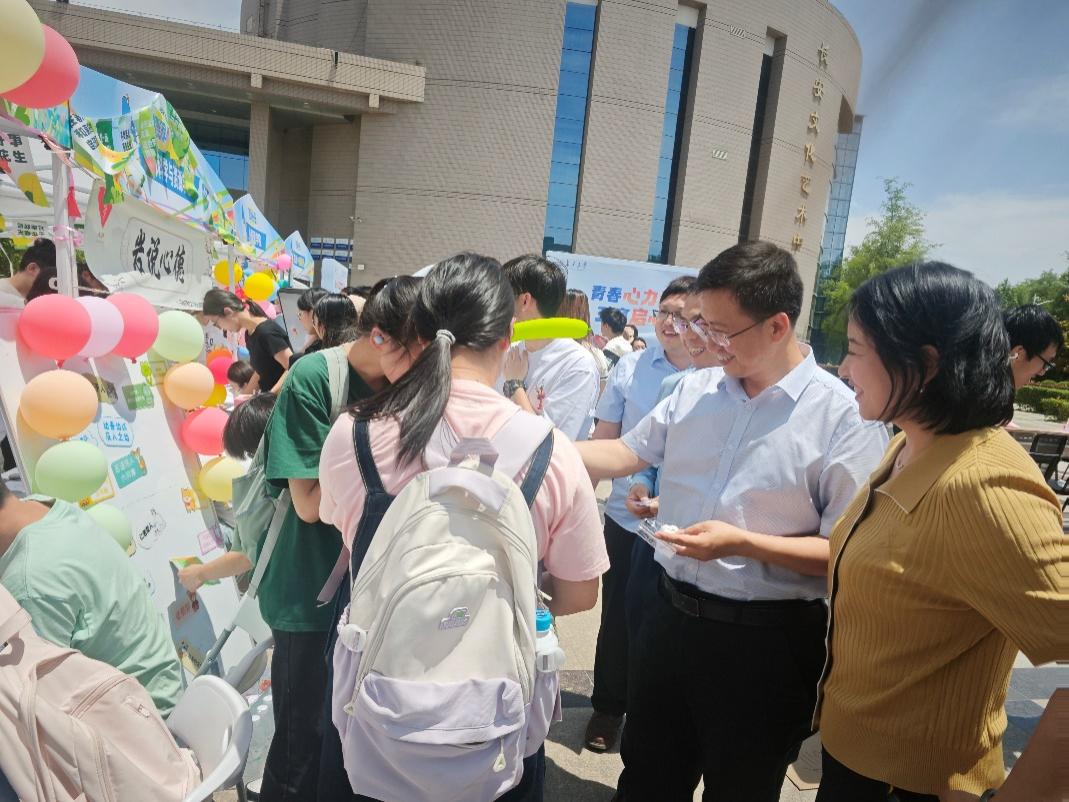渭水畔心海晴澜,校园中欢情舒展。5月23日中午,后宫电影院 第2个全国学生心理健康宣传教育月主题活动暨“3·25-5·25”大学生心理健康教育季实践活动展示活动在北校区树蕙园广场举行。校党委副书记李文雄一行来学院活动现场指导心理工作。