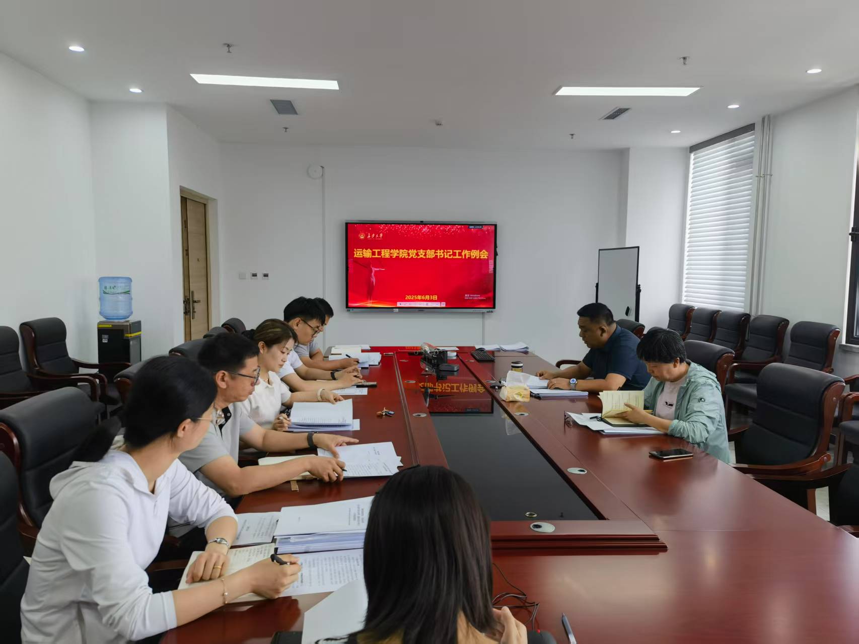 6月3日,运输工程学院在北校区明德园智通大厦603会议室分别召开党委会和党支部书记工作例会,传达学习学校第五次党代会精神,对贯彻落实有关工作进行安排部署。党委会由学院党委委员参加,党支部书记工作例会由学院党委书记、副书记、教工党支部书记、党委秘书和学生党建秘书参加。会议由学院党委书记史少鹏主持。