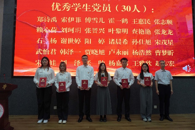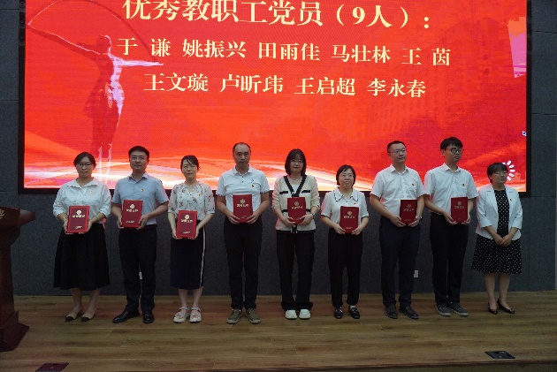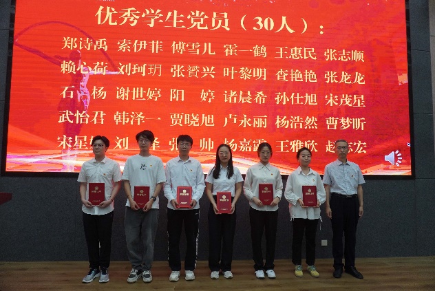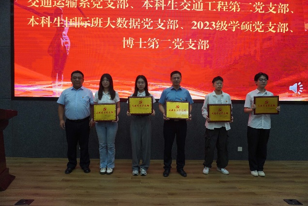 院党委副书记、副院长、纪委书记吴喜梅宣读了《关于表彰优秀共产党员、优秀党务工作者和先进党支部的决定》。参会领导为受表彰的集体和个人代表颁发奖牌和证书。交通运输系党支部书记汪勇杰、2023级硕士生党员石杨分别作为先进党支部代表和优秀共产党员代表发言。