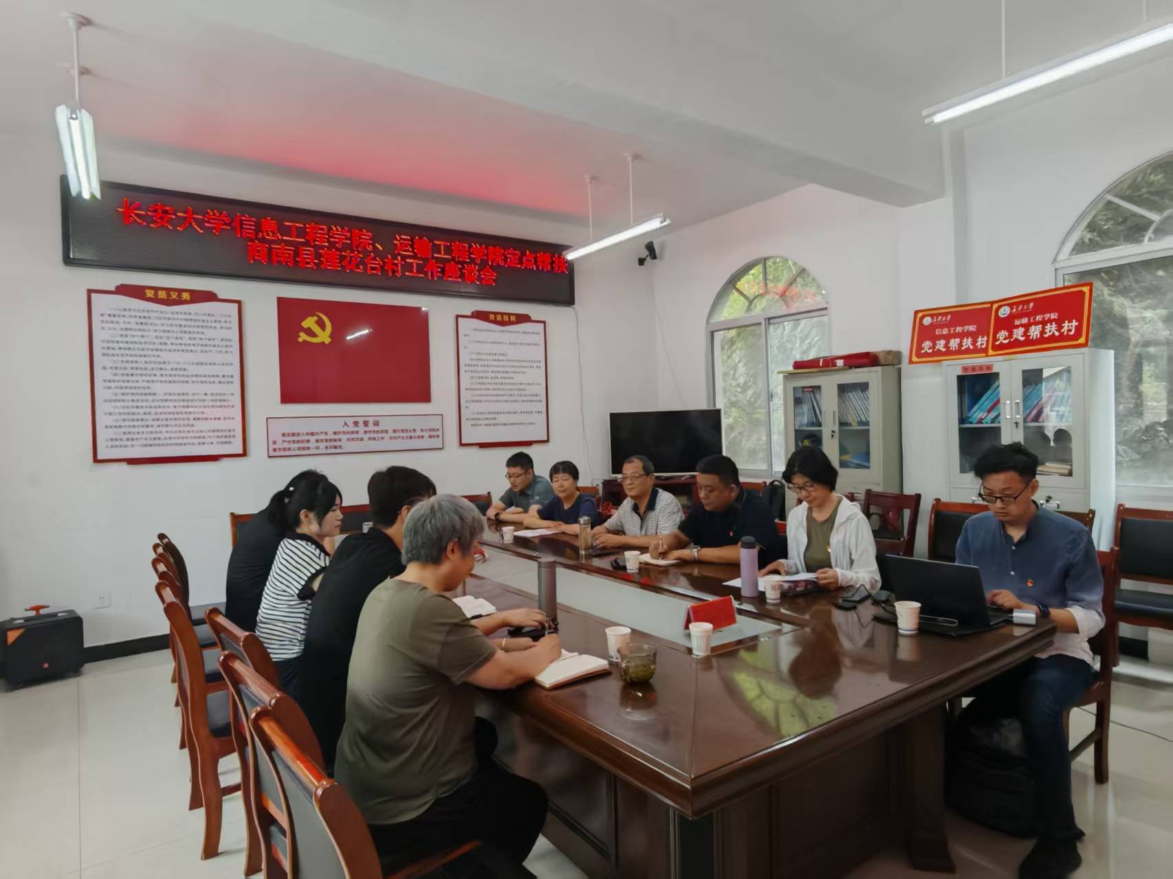 在湘河镇莲花台村党群服务中心会议室,两院党委与村党支部共同举行了乡村振兴帮扶工作座谈会暨联学共建活动,活动由莲花台村驻村第一书记付石主持。围绕深入贯彻中央八项规定精神学习教育,信息工程学院党委副书记、副院长、纪委书记陈沛通报了《教育部直属系统违反中央八项规定及其实施细则精神典型案例》;后宫电影院 党委副书记、副院长、纪委书记吴喜梅领学了《八项规定改变中国》;莲花台村党支部书记廖自飞以“争做优秀共产党员”为题,结合莲花台村村史村情、基层工作实践经历分享了个人体会;与会人员围绕数字乡村管理服务平台、乡村文明精神堡垒建设等进行了深入交流和探讨。
