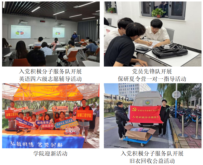 践行服务奉献,投身多元实践与志愿服务。牢固树立奉献意识,主动投身各类实践服务,以实际行动践行宗旨、服务师生。积极组织同学参与学院迎新工作,以热情周到的服务迎接新生。面对学院具体事务需求迅速响应,先后组织毕业生档案邮送、学院物品搬运等专项志愿者活动,保障了学院工作的顺利运转。在公益环保领域,组织了旧衣回收公益活动募集旧衣传递温暖体现了绿色理念与社会担当。学院学生党员先锋队与入党积极分子服务队累计志愿服务时长超400小时,志愿者参与人数超80人,服务对象超600人。这些扎实的服务行动,不仅解决了实际问题,更在劳动与奉献中锤炼了队伍成员的品格,弘扬了志愿服务精神。
